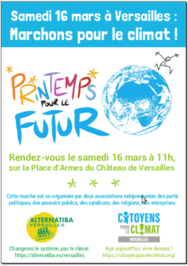 Soyons encore plus nombreux·ses à déambuler joyeusement avec nos pancartes le samedi 16 mars à 11h à la place d’Armes devant le château de Versailles pour le climat et la transition écologique et solidaire afin de montrer notre engagement aux politiques et aux citoyens et les inviter à nous rejoindre !